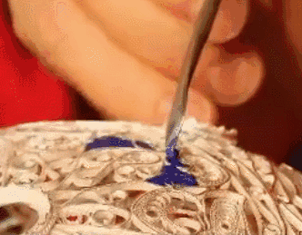 燒藍(lán) 是將整個胎體填滿色釉后,再拿到爐溫大約800℃的高爐中烘燒,色釉由砂粒狀固體熔化為液體,待冷卻后成為固著在胎體上的絢麗的色釉,此時(shí)色釉低于銅絲高度,所以得再填一次色釉,再經(jīng)燒結(jié),一般要連續(xù)四五次,直至將紋樣內(nèi)填到與掐絲紋相平。